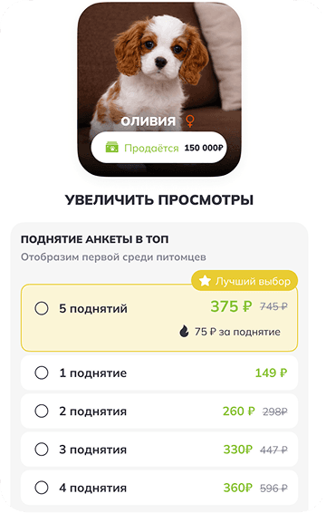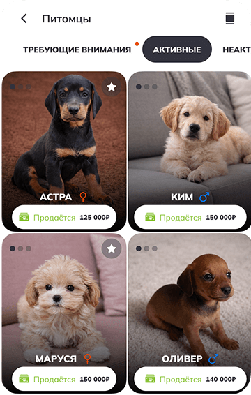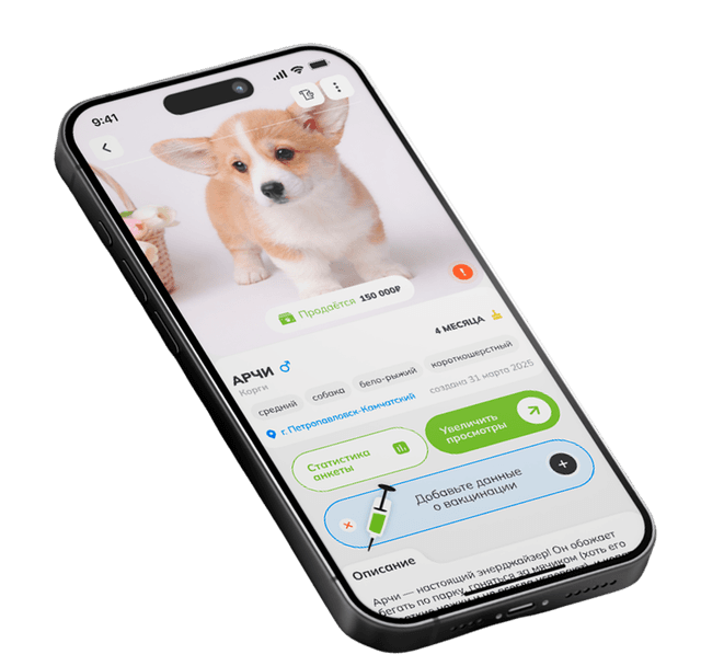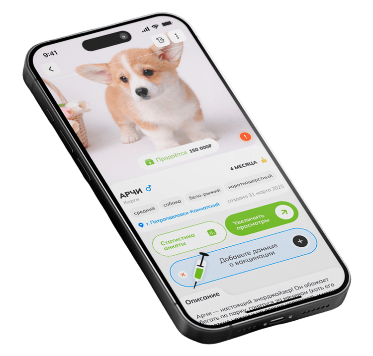 Создайте анкету питомца на продажу, для этого нажмите кнопку «+» на экране «Питомцы», выберите статус «Продается» и заполните обязательные поля. После проверки анкета появится на экране «Питомцы» и будет доступна для просмотра по всей России.